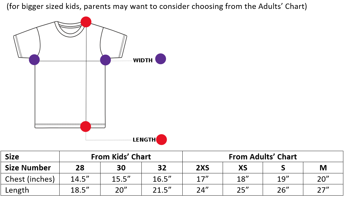 To gauge a child's T-Shirt size, you may use an existing one that you own that fits the child and measure Point-to-Point for the chest width and the length in inches (see diagram & chart below). Important: Please account for your Child's growth and note that there is a manufacturing tolerance of +/- 0.5 inches. Please note exchanges will be unlikely.